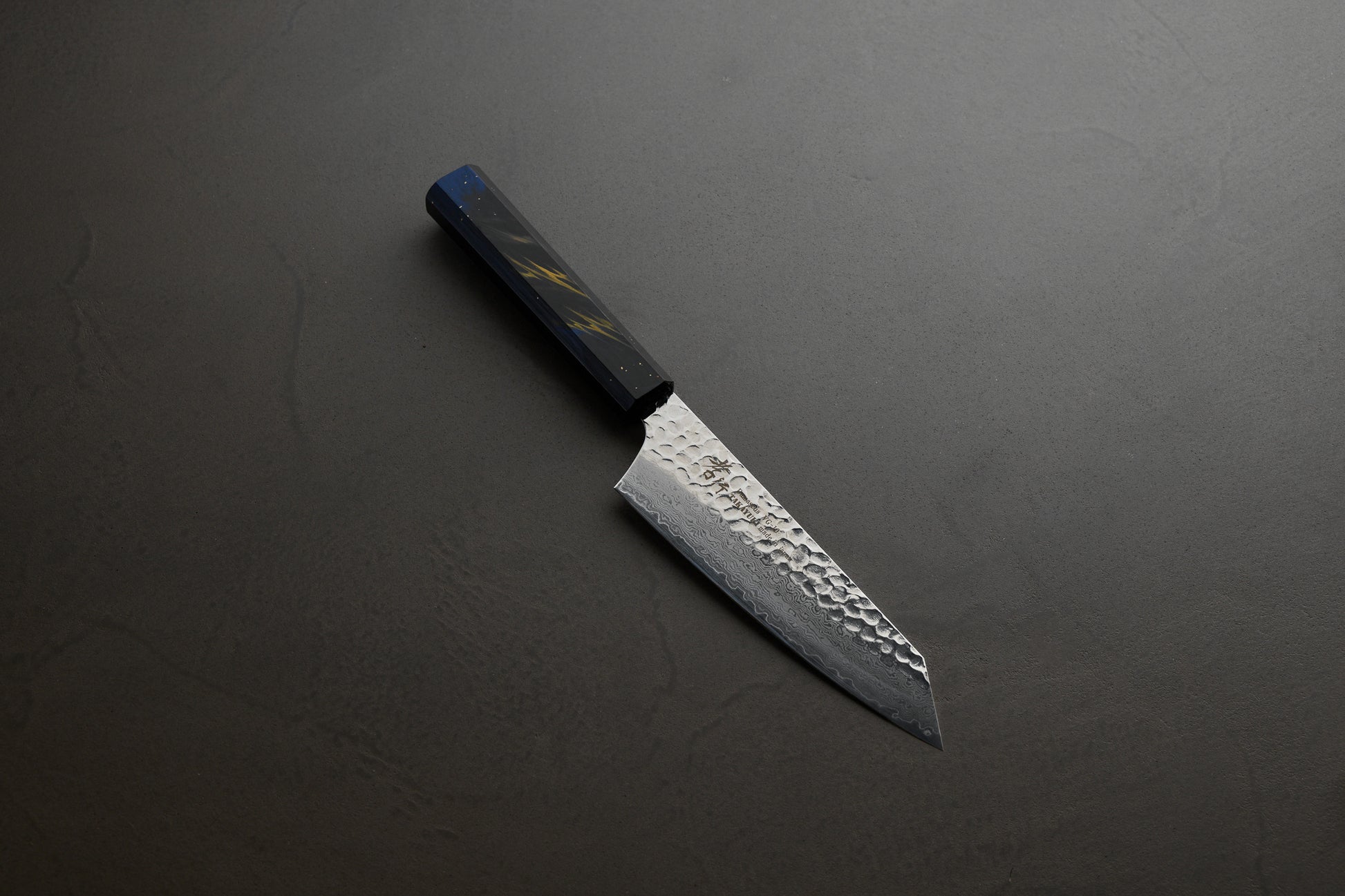 - 意匠: 33層のダマスカス模様の優美さと、彩り豊かな「彩石」ハンドルの組み合わせ、そこに攻撃的な剣型のフォルムが加わり、キッチンに置くだけで空間をラグジュアリーに彩ります。
