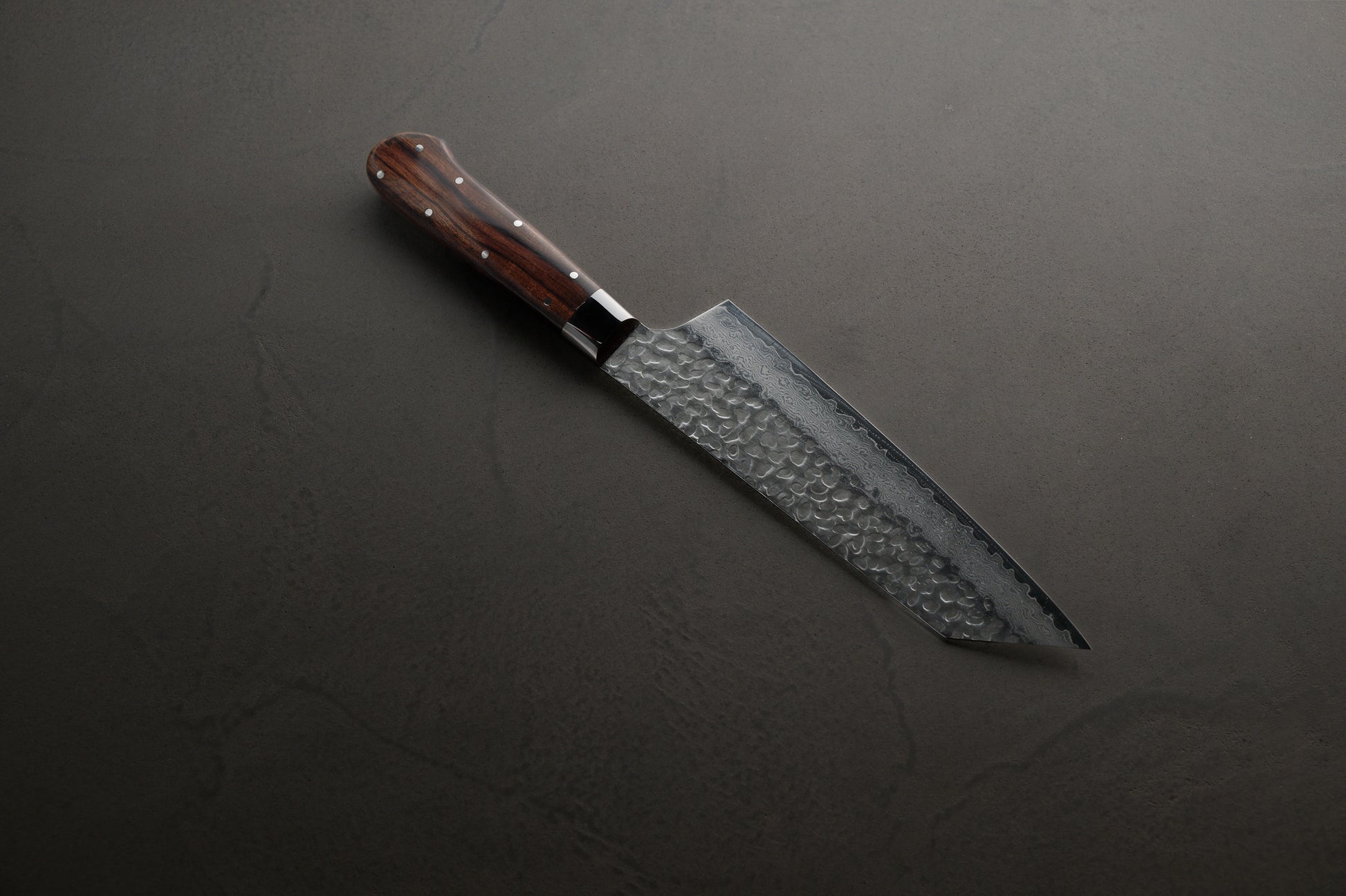 - 素材(ブレード): 芯材には、高級ステンレス鋼「V金10号(VG-10)」を採用。錆に強く、鋭い切れ味が長く続きます。刀身の「槌目(つちめ)」加工は、食材の張り付きを防ぐ機能性と、荒々しくも美しいデザイン性を兼ね備えています。