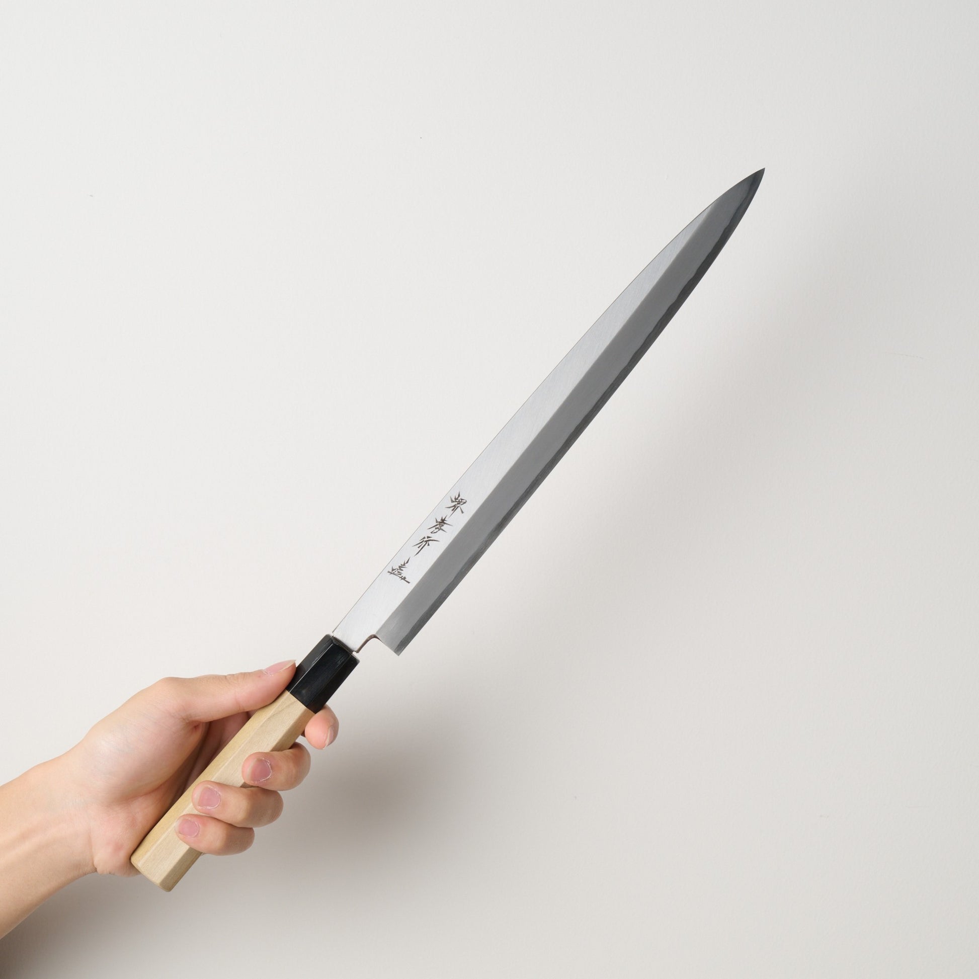 - 用途: 関西では「正夫(しょうぶ)」、関東では「柳刃」と呼ばれる、刺身を引くための専用包丁。300mmという長い刃渡りは、大型の魚の柵(さく)も一引きで切り切ることができ、断面の角が立った美しい刺身に仕上げるプロ仕様のサイズです。