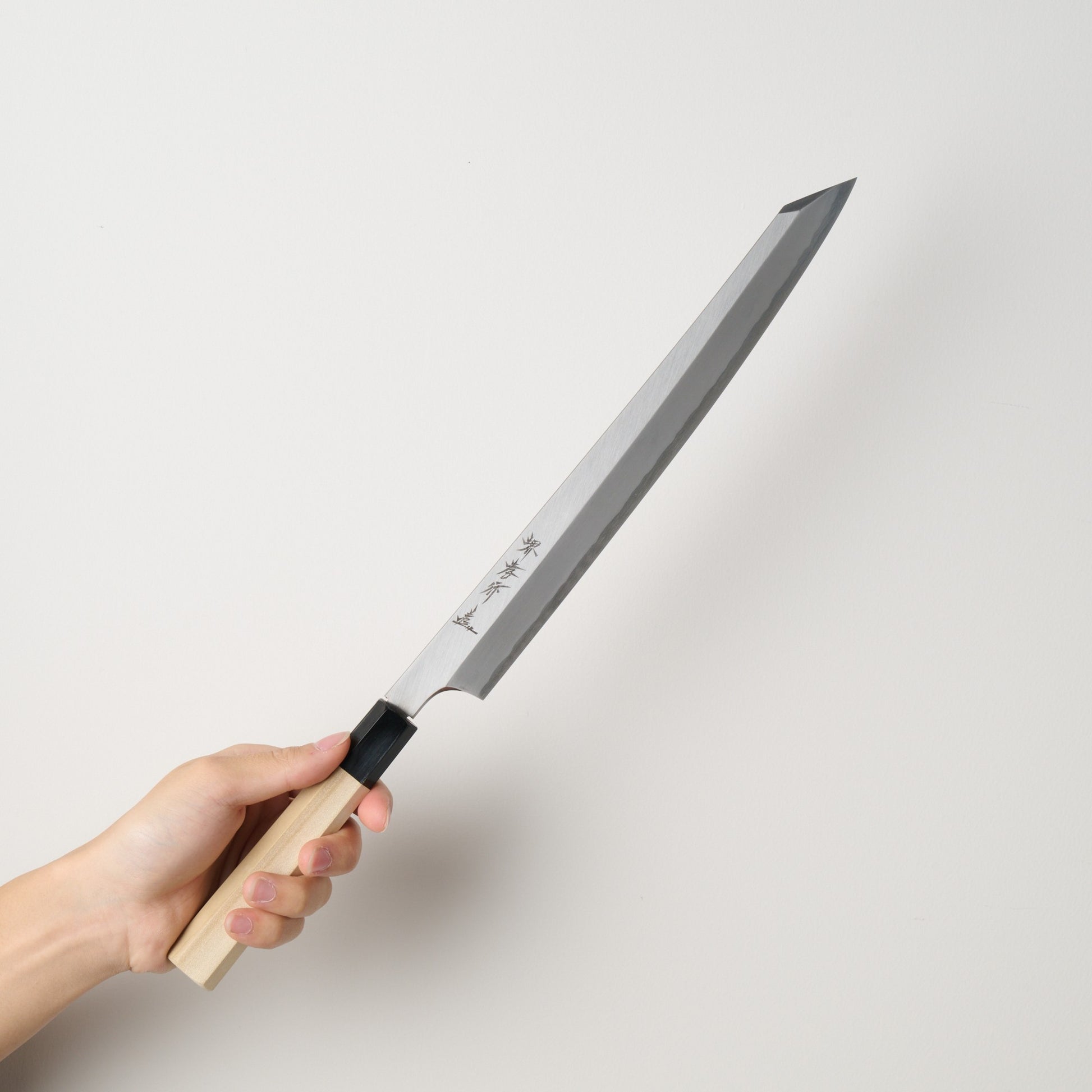 - 用途: 300mm(尺)の刃渡りを持つ、大型の剣型柳刃。「飛燕(ひえん)」と呼ばれる鋭い切っ先と、長い刀身が織りなすシルエットは、まさに日本刀そのもの。長い引き切りが可能で、大型魚の柵取りはもちろん、カウンター越しのお客様を魅了する調理パフォーマンスに最高の演出力を発揮します。