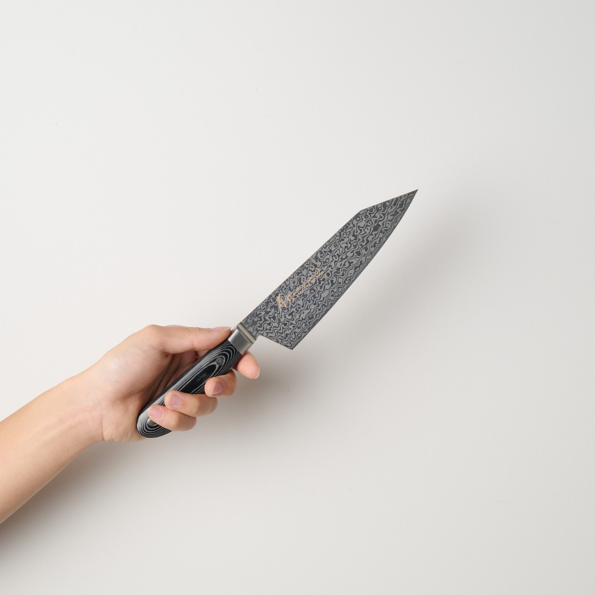 - 用途: 肉・魚・野菜と幅広い食材に対応する万能包丁ですが、切っ先が鋭く尖った「剣型(文化包丁)」のフォルムをしているのが特徴です。通常の三徳包丁よりも刃先を使った細かな作業がしやすく、肉の筋切りや野菜の飾り切りなどもスムーズに行えます。160mmというサイズは取り回しが良く、家庭用として非常に使い勝手の良い長さです。