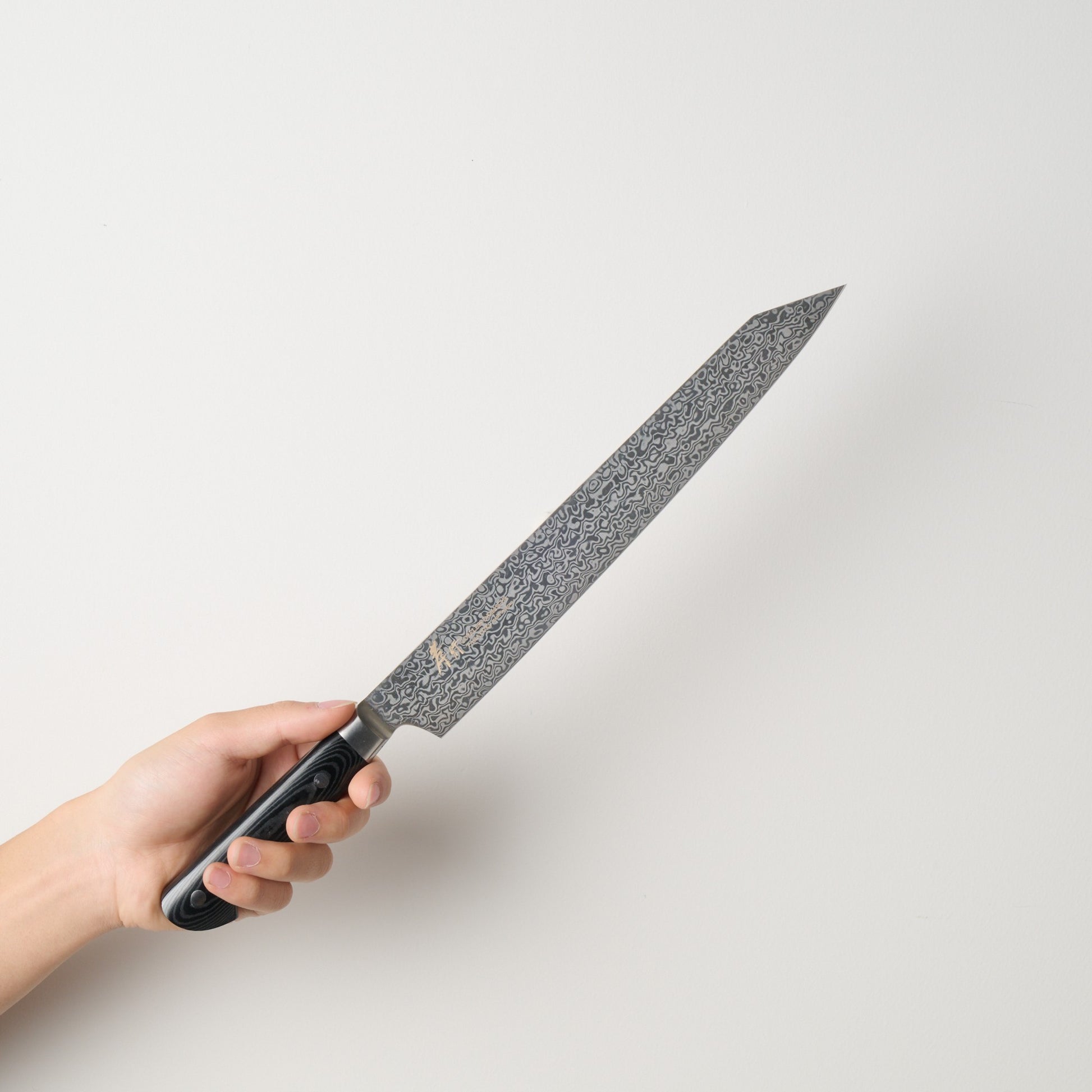- 用途: 刺身を引くための柳刃包丁の中でも、切っ先が鋭く尖った「剣型(切付型)」と呼ばれるモデルです。260mmというサイズは、家庭用の240mmでは少し短いが、プロ用の270mmでは長すぎるという方に最適な、取り回しと長さを両立した希少なサイズ感です。鋭利な切っ先を使い、飾り切りや細かい細工もスムーズに行えます。