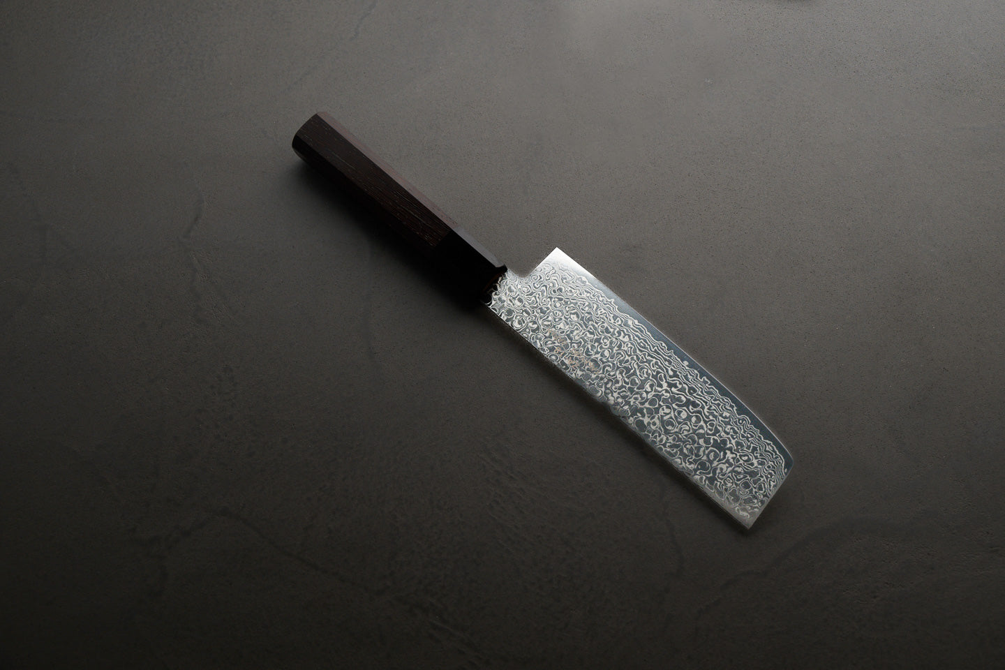 - 柄: 濃い褐色と独特の木目が美しい銘木「ウェンジ」を使用した和式ハンドル。深みのあるダークブラウンは、モダンなキッチンにもよく馴染みます。従来の木柄よりも軽量で重心が手元に近いため、トントンと刻む作業も疲れにくい設計です。