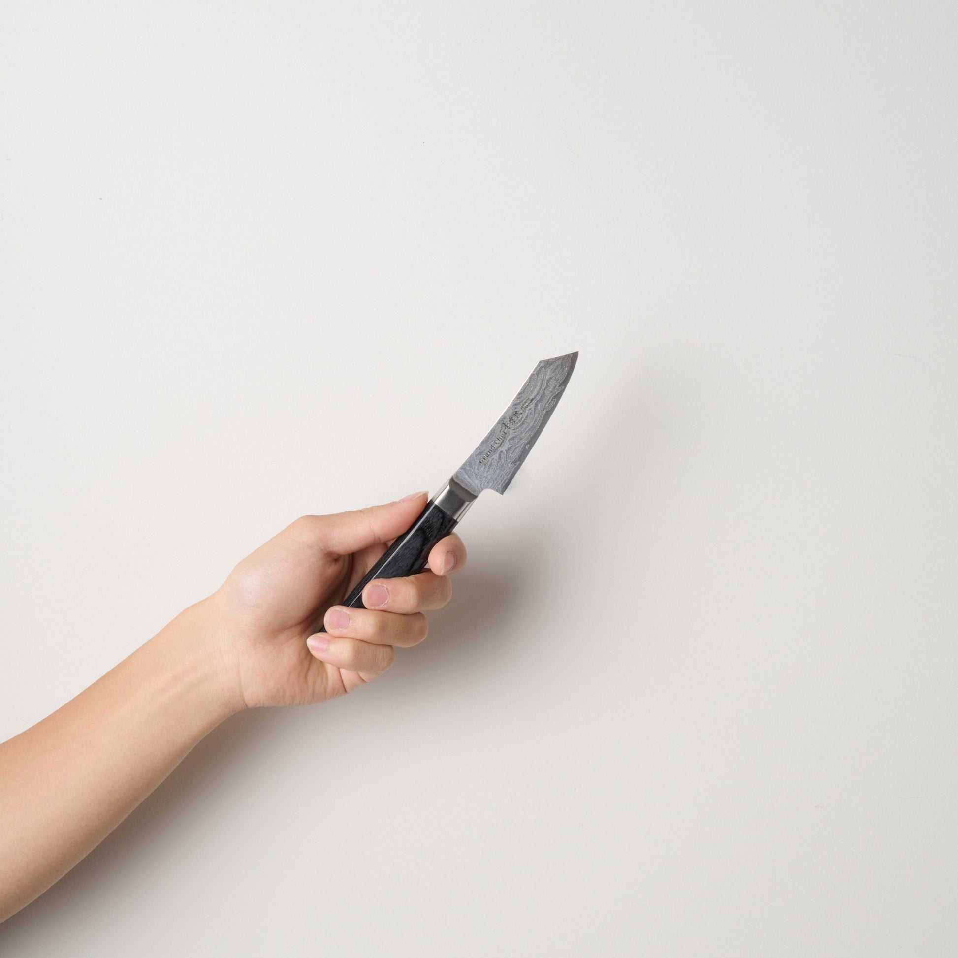 - 用途: 手に持って行う果物の皮むきや、野菜のヘタ取り、飾り切りなどに特化した小型ナイフ。切っ先が鋭い「剣型」の形状は、細かな箇所にも刃先が入りやすく、繊細な作業を意のままにコントロールできます。