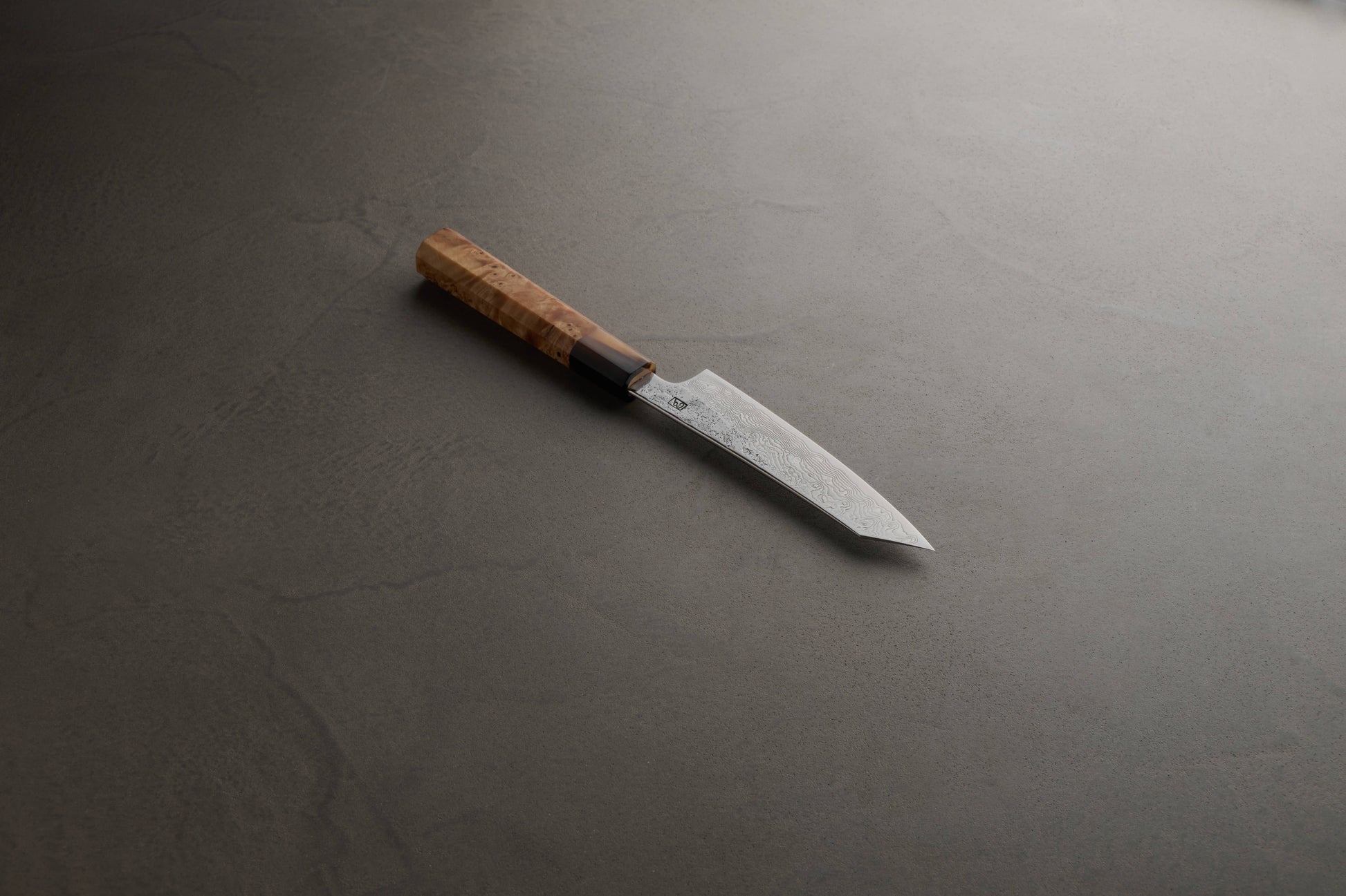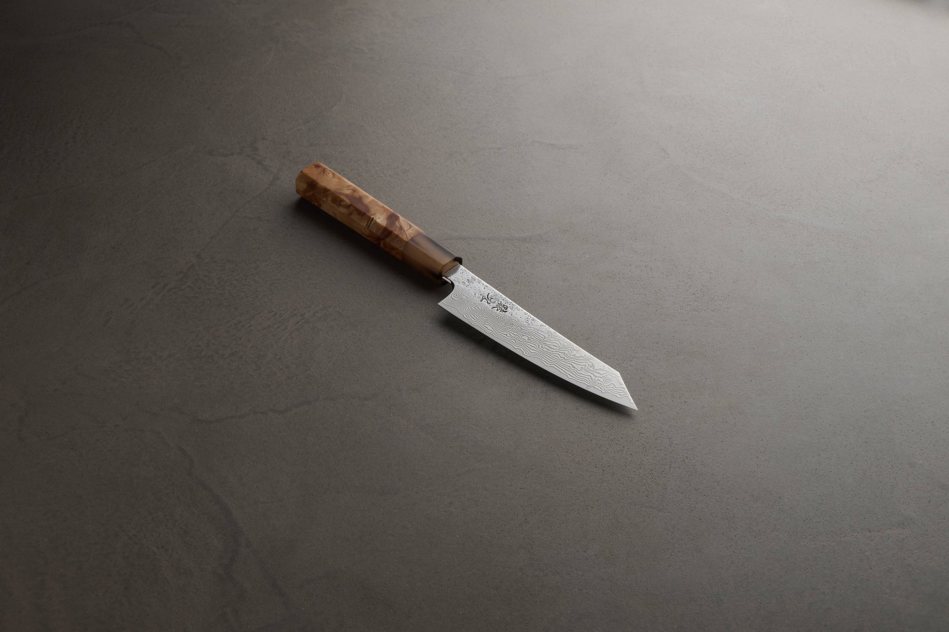 - 刀身: 全長に対し非常に贅沢な「刃厚3mm」の重厚な造り。一般的なペティナイフのような頼りなさは一切なく、厚みのある背と適度な重量感が、小さな食材を切る際にも抜群の安定感をもたらします。多層鋼が描く「焔雲」の紋様は、小さくとも力強い存在感を放ちます。